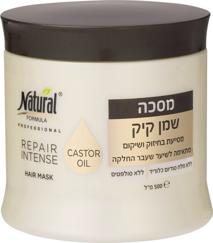 מסכה שמן קיק של נטורל פורמולה לשיער חלש, שביר ופגום, מכיל 89% מרכיבים ממקור טבעי ומועשרת בשמן קיק וחמאת מנגו.