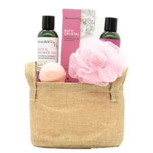 מארז Bloomfield הכולל חמישה מוצרי טיפוח, מסודרים בסלסלה דקורטיבית, לשילוב של טיפוח והגשה אסתטית כסט אחד.