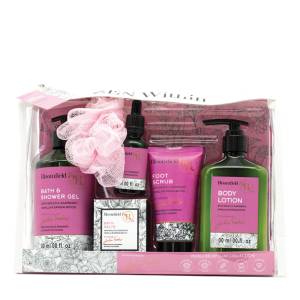 מארז Bloomfield הכולל חמישה מוצרי טיפוח, ארוזים בתיק שקוף ונוח, מושלם לנסיעות, לשימוש יומיומי או כמתנה.