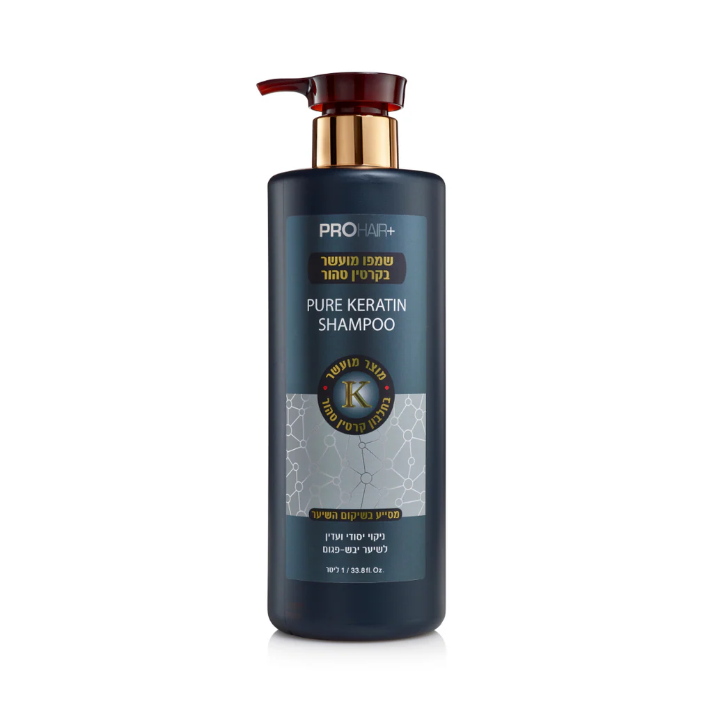 שמפו טיפולי עם קרטין טהור וחמאת שיאה ללא מלחים (סולפטים) מבית +ProHair, שומר על השיער ומאזן את רמת ה-pH בשיער, מסייע לשיקום מרקם השערה ומקנים לשיער ברק, חיוניות ומראה זוהר.